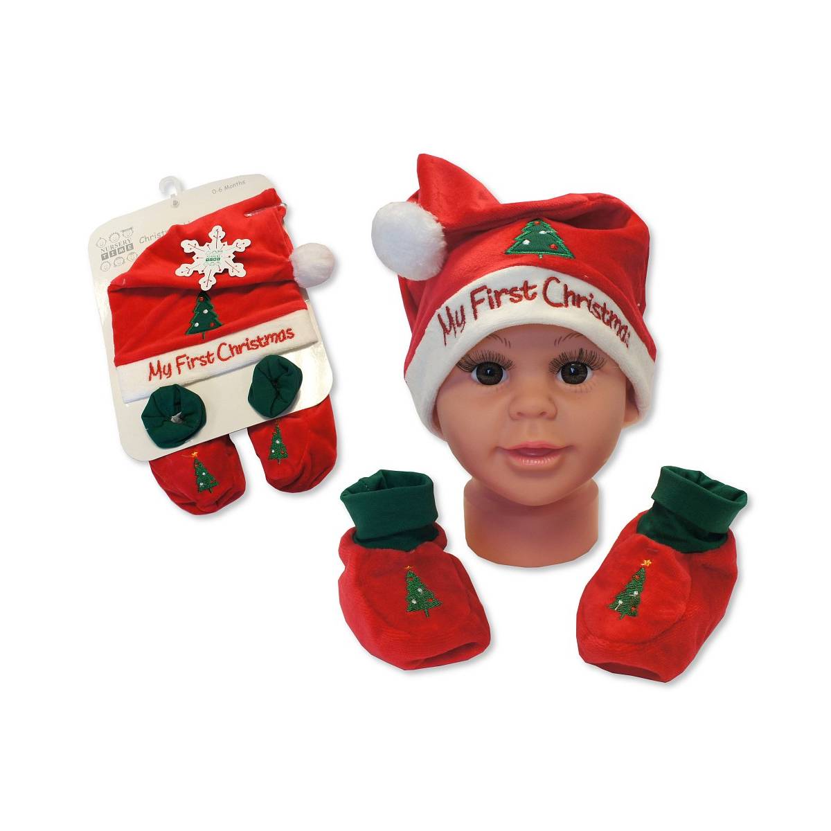 Baby ivory and red 'My First Christmas' pompom Santa's hat and mittens with snowflake motif.