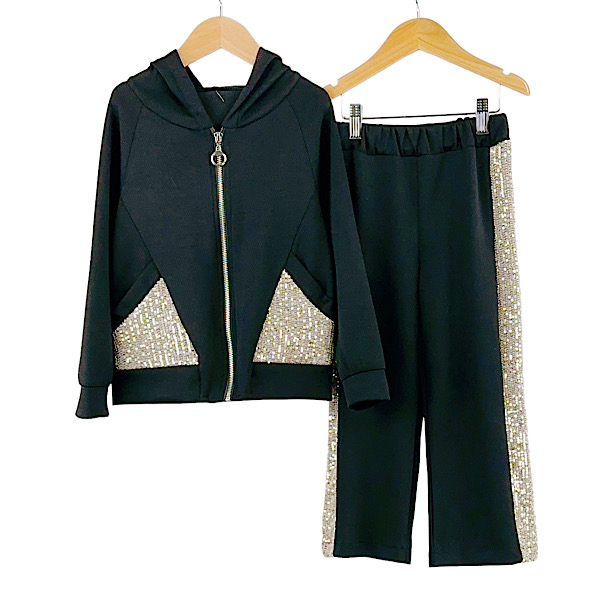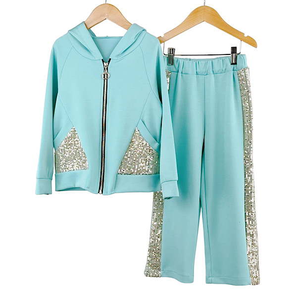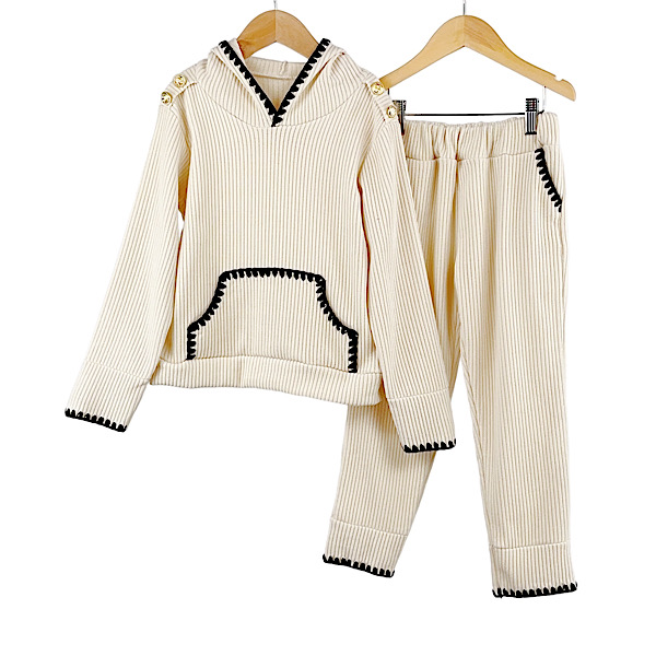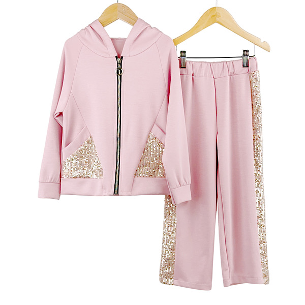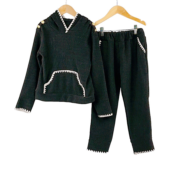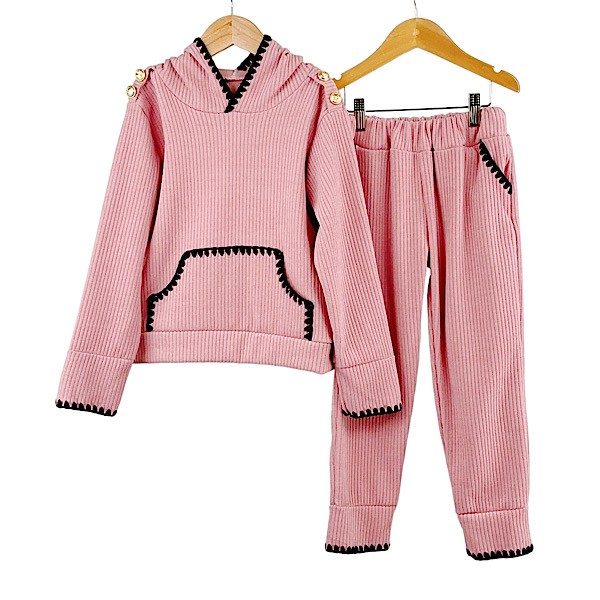 Girls ribbed two piece co-ord set with shoulder ruffle frill detail sweatshirt top paired wth wide leg trouser pants with elasticated waist.