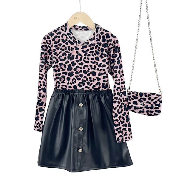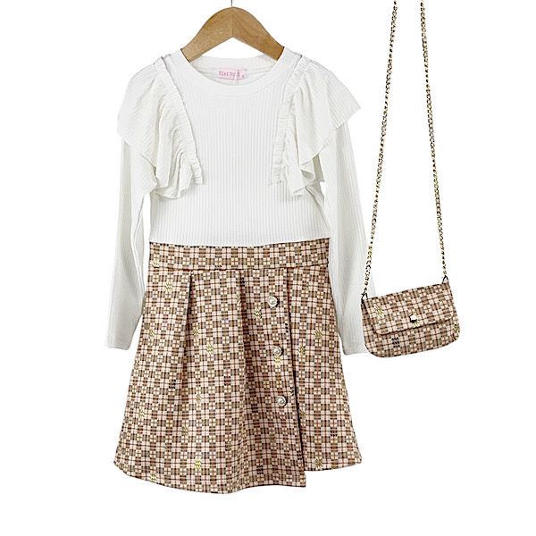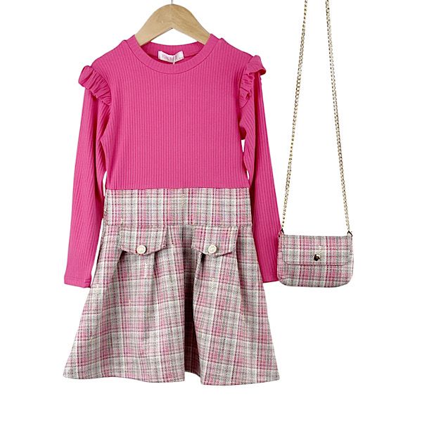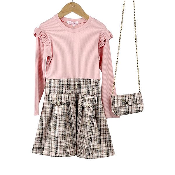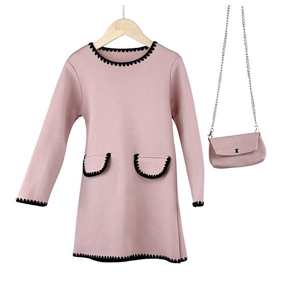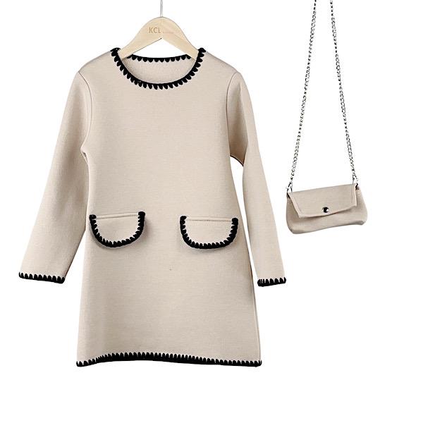 Kids two tone black and white woven long sleeve bodycon style jumper dress with 'MW' motif, pearl buttons and double ring faux waist belt.