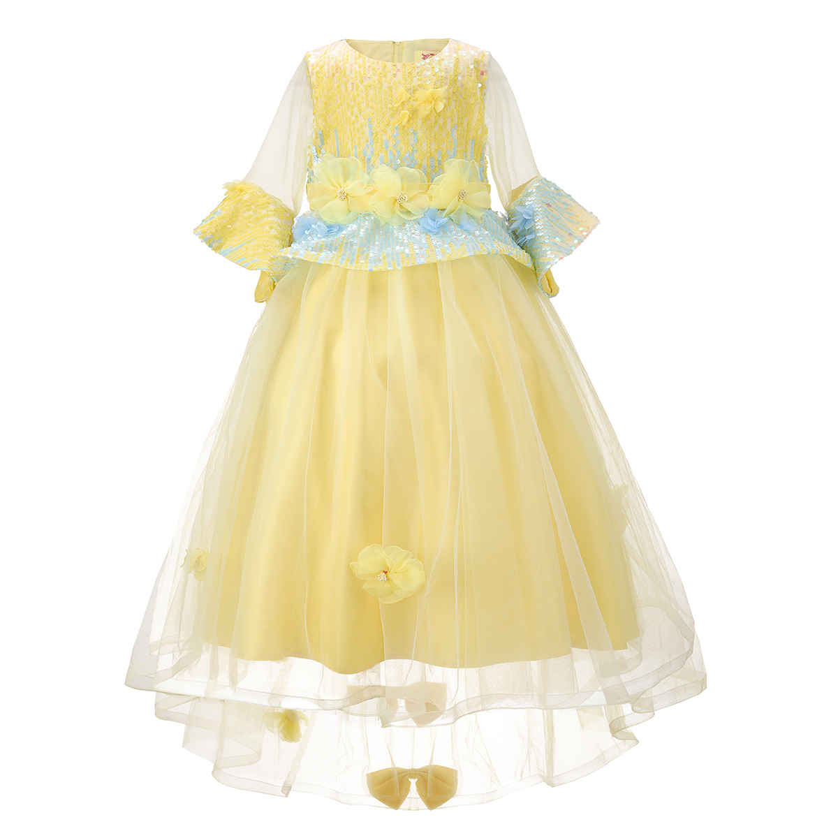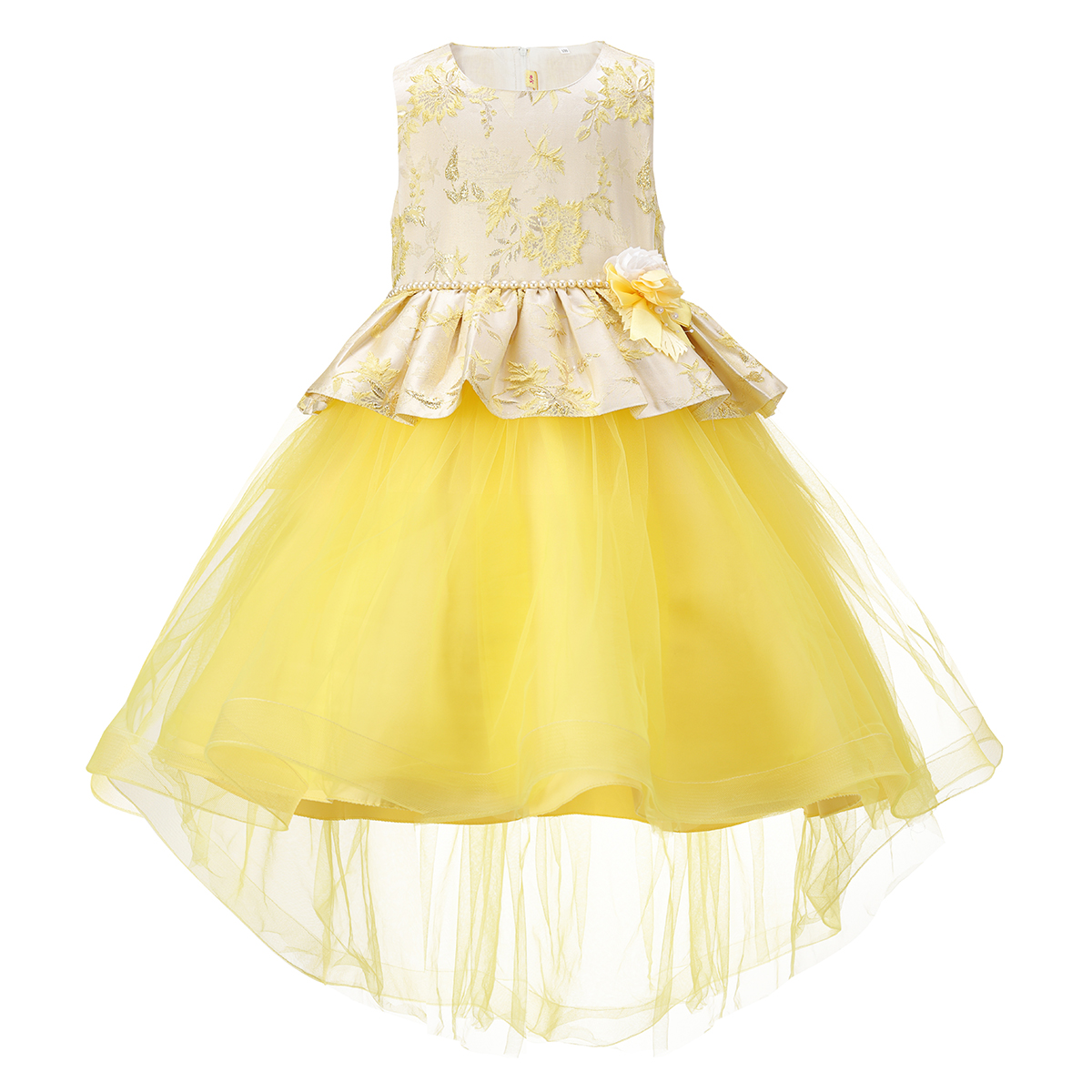 Kids pastel yelllow floral embossed organza dress with flower appelique, satin bow ribbon sash and lining.
