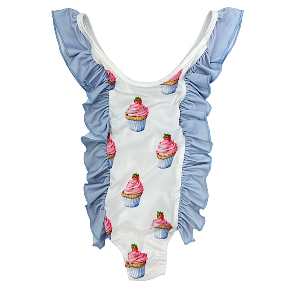 Girls Sky/Pink Cupcake Bow Frill Swimsuit 2-8