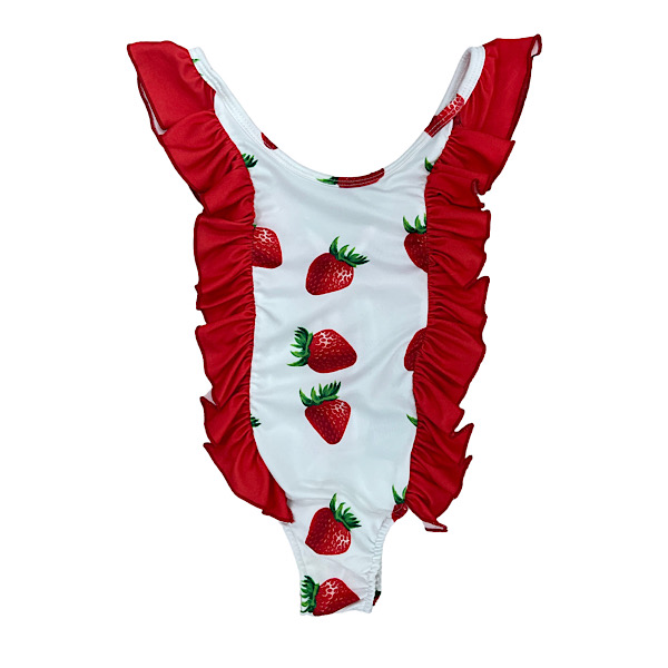 Girls strawberry motif print swimsuit with red frill trim and back bow detail.