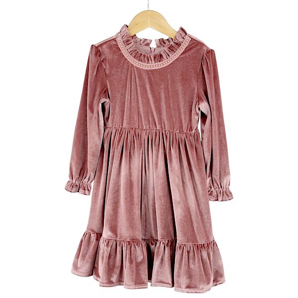 Wine Red Velour Pussy Bow Ruffle Dress 4-14
