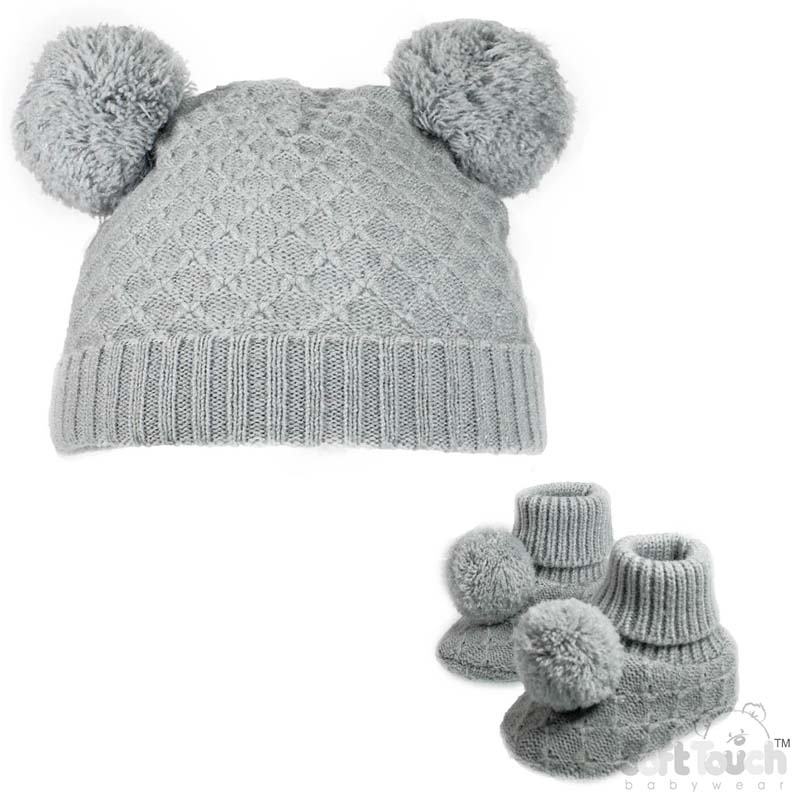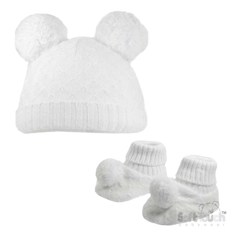 Baby biscuit knitted pom pom beanie hat paired with co-ord pom pom booties with ribbed roll-down ankle detail.