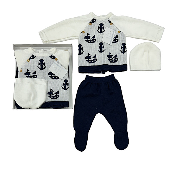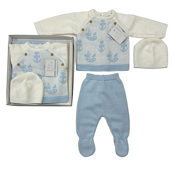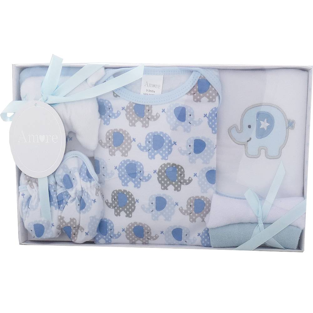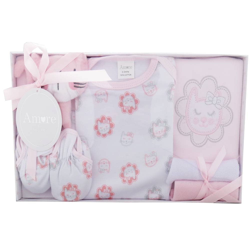 Baby pink four-piece layette gift set including knitted woven pullover with bow embossed motif, co-ord leggings, mittens and beanie hat. Complimentary gift box included.