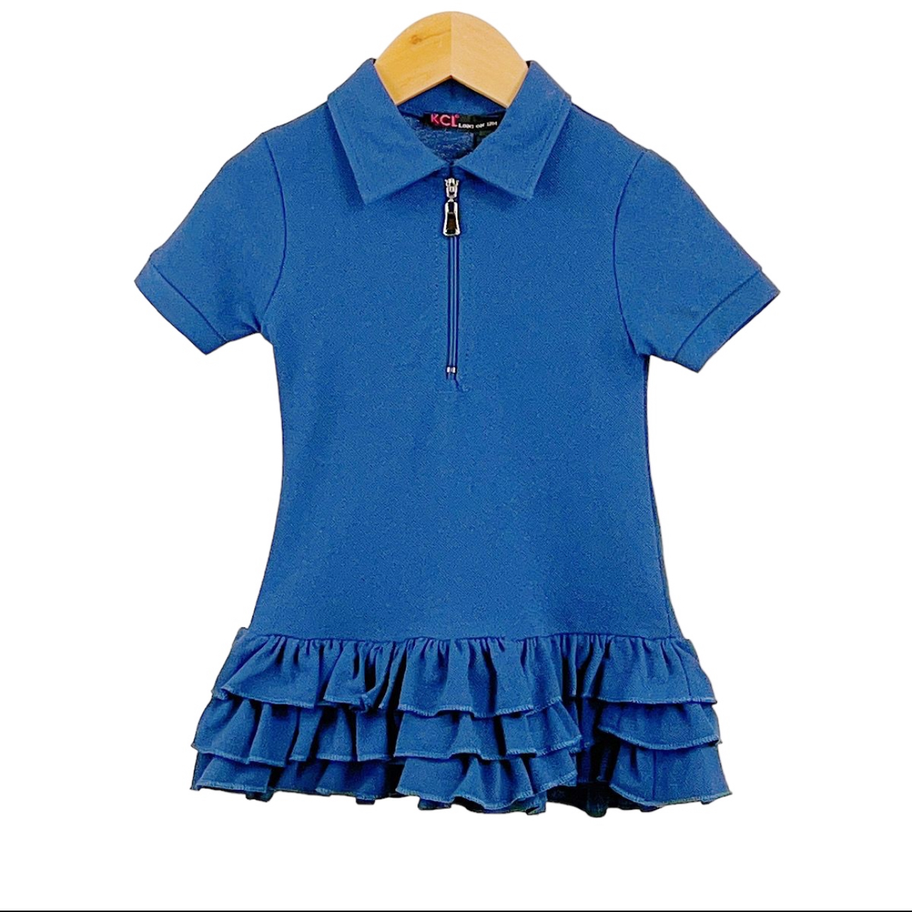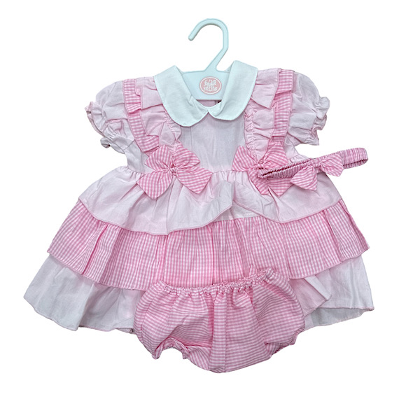 Baby & Toddlers two tone dusty pink & light blue floral print contrast layered sleeveless dress with ruffle trim collar and bows paired with co-ord knicker pants set.