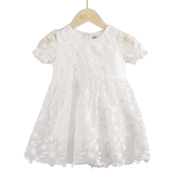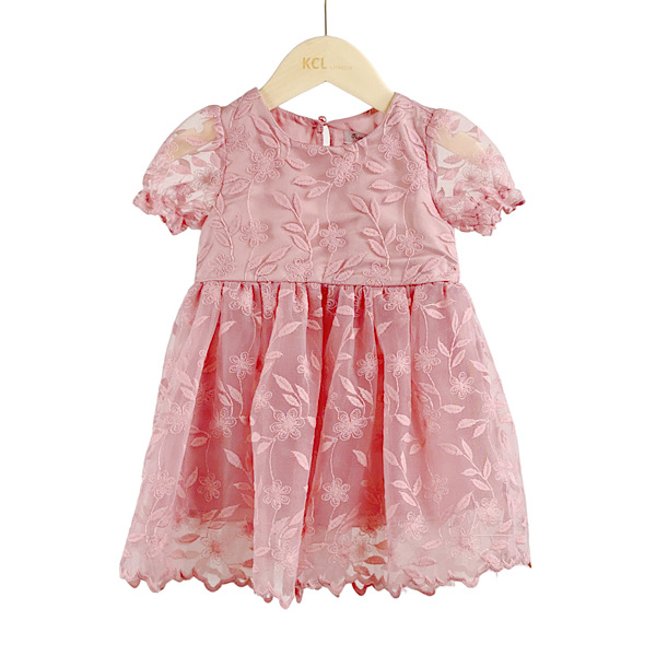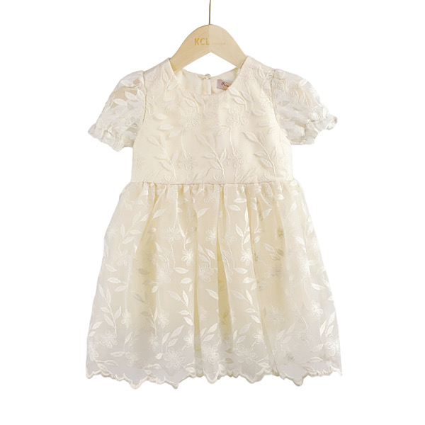 Kids gold floral mesh net overlay dress with frilled capped sleeves, satin bow sash and back zip fastening.
