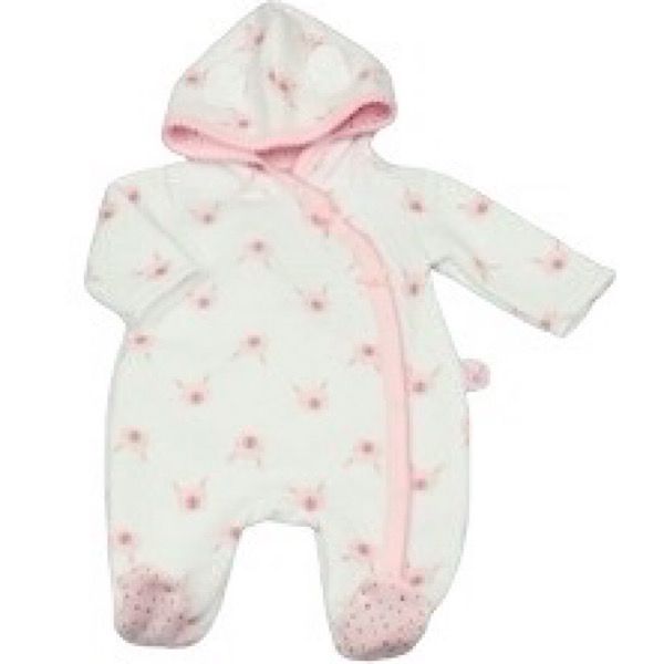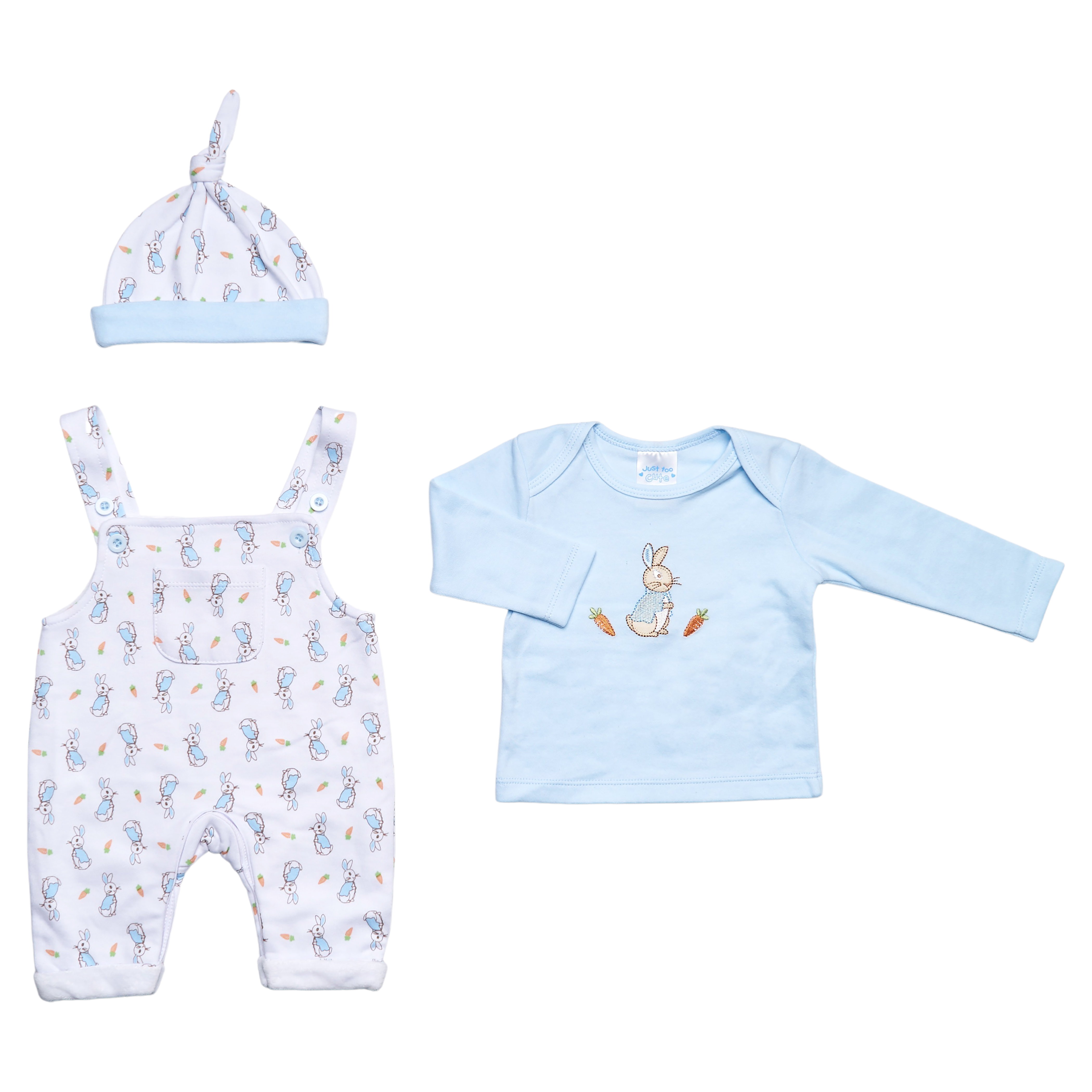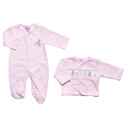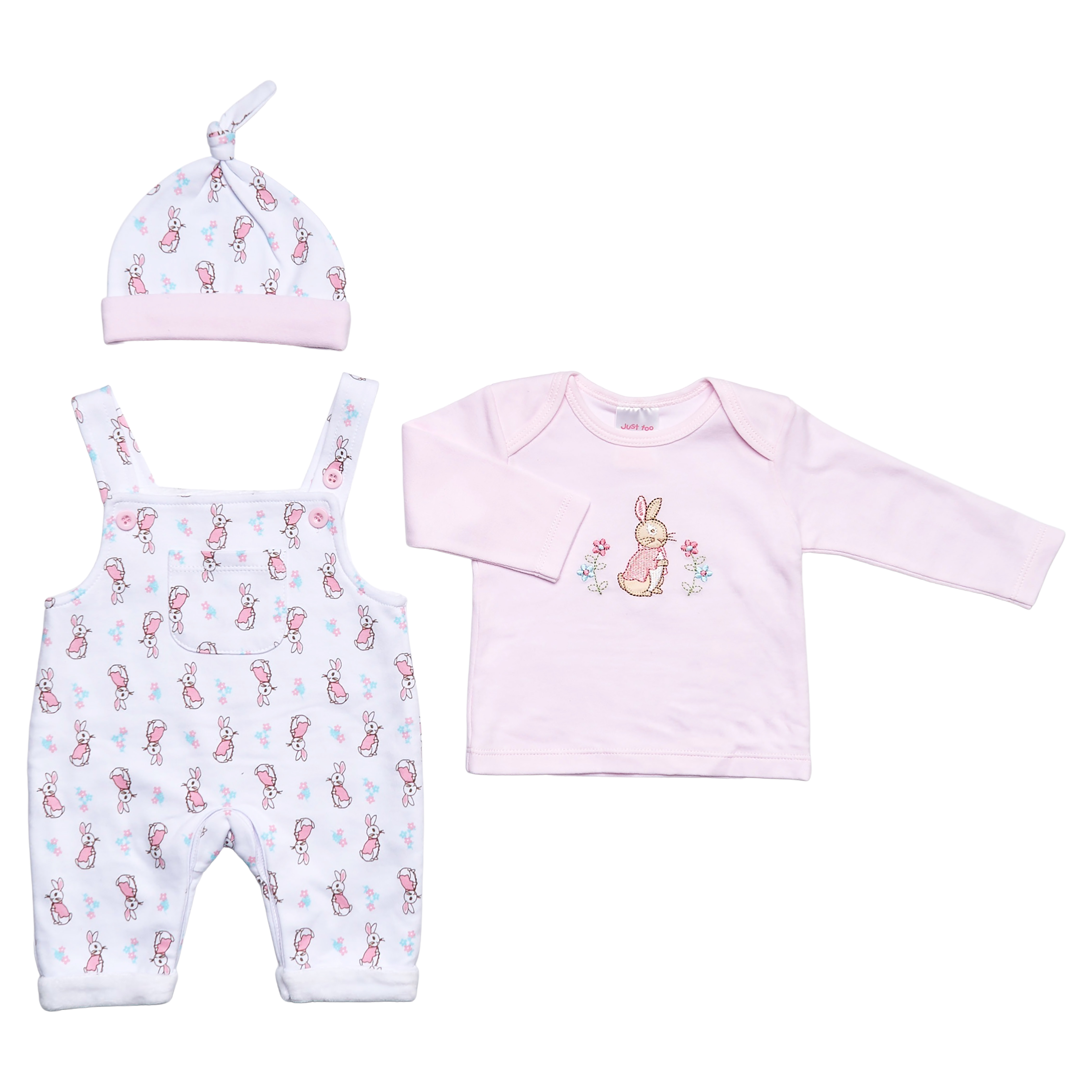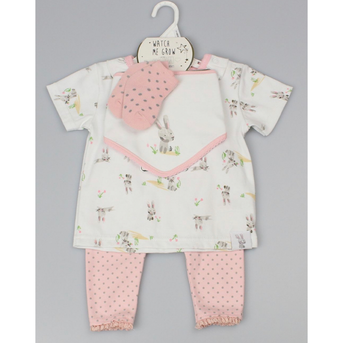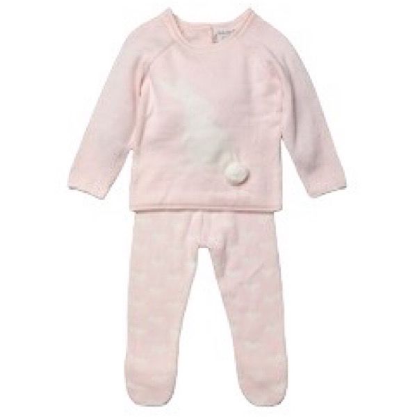 Baby ivory scallop trim knitted four-piece layette set including bunny rabbit motif pullover, co-ord leggings, mittens and bobble beanie hat. Complimentary gift box included.