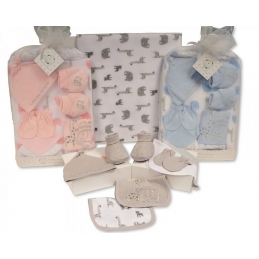 Baby ivory four-piece layette gift set including pointed Buttoned up knitted woven butterfly cardigan, co-ord leggings, mittens and beanie hat. Complimentary gift box included.