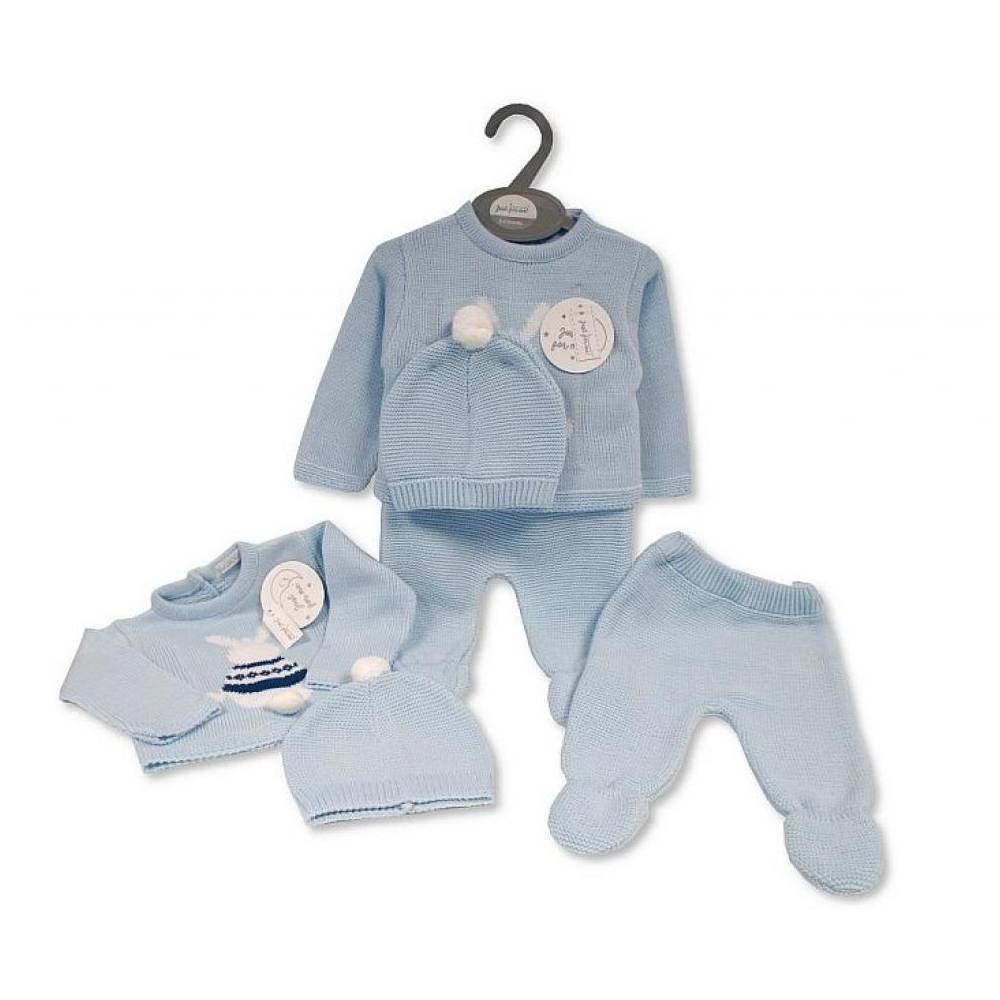 Baby ivory white and pink bunny motif print 5pc layette set with sleepsuit, bodysuit, bib, beanie hat and mittens.