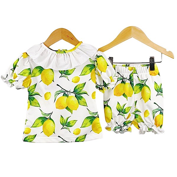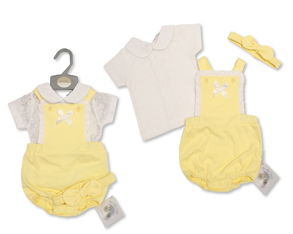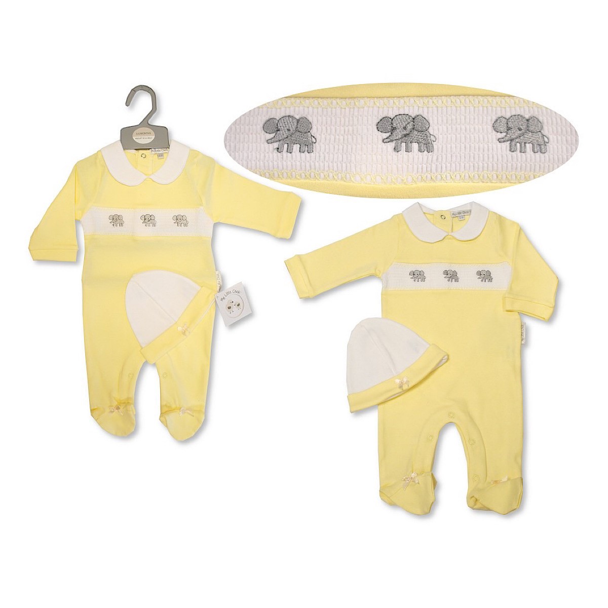 Baby two tone lemon & ivory colour contrast sleepsuit with peter pan collar and smocked embroidered ducklings panel paired with co-ord beanie hat.