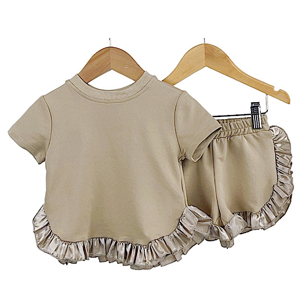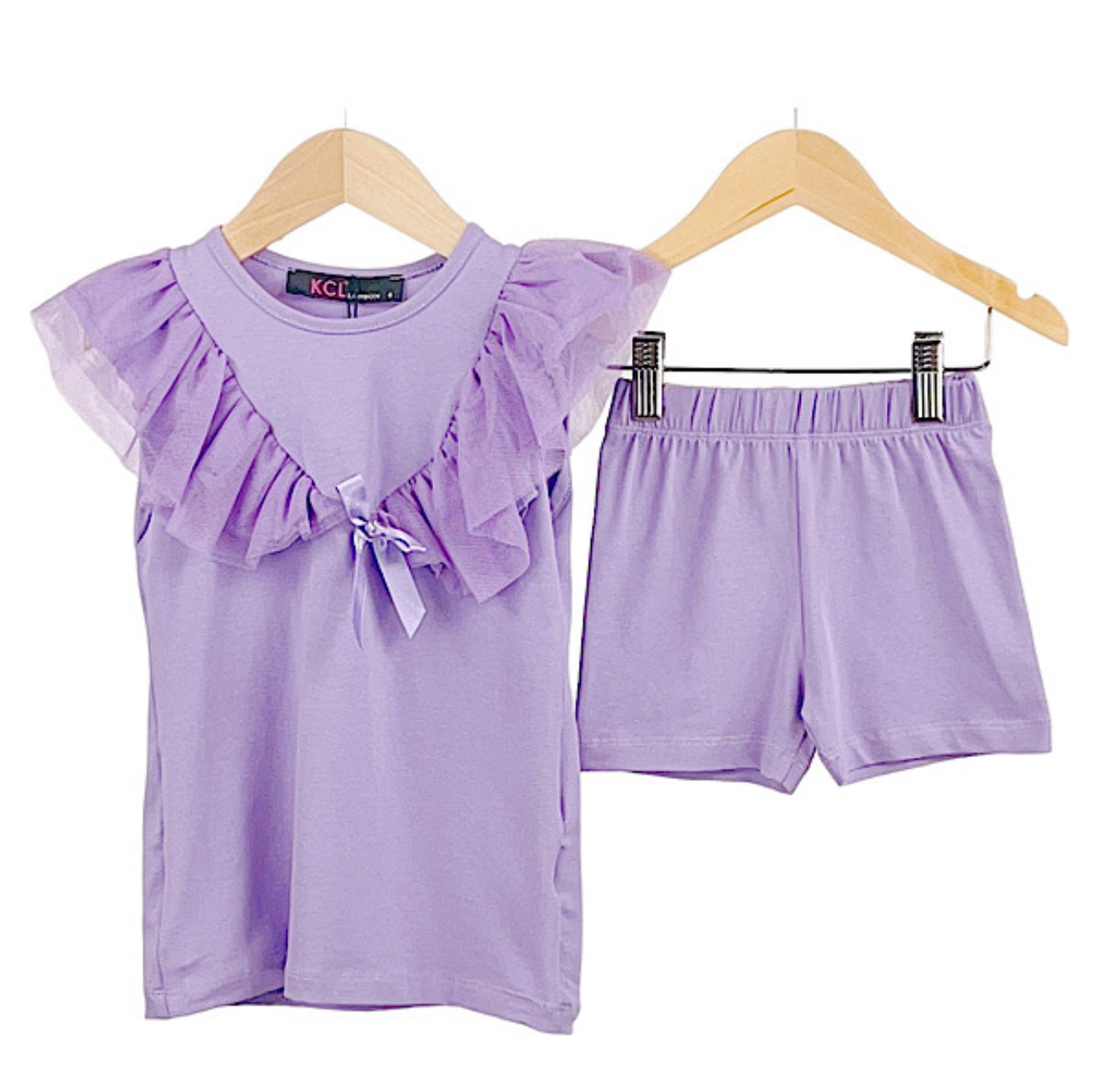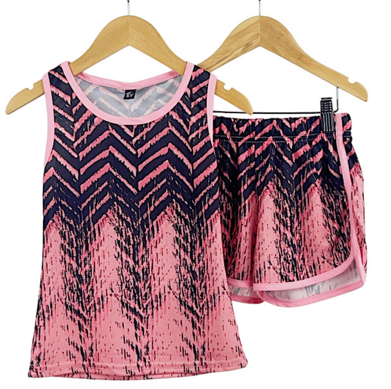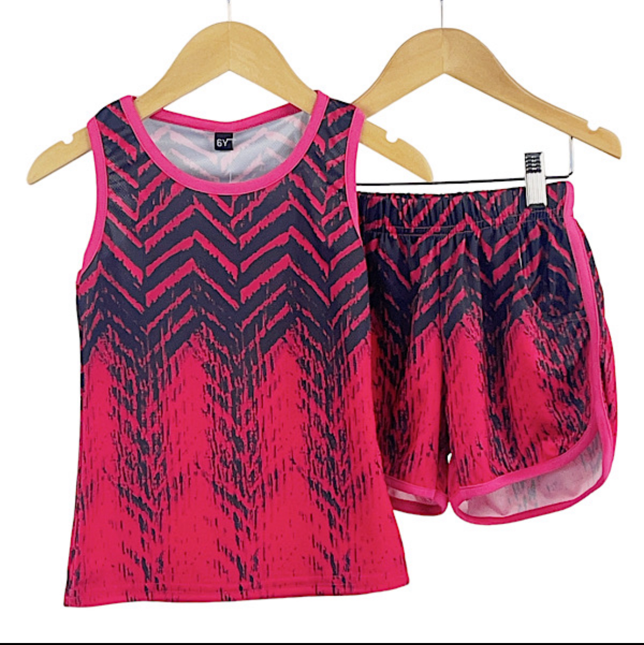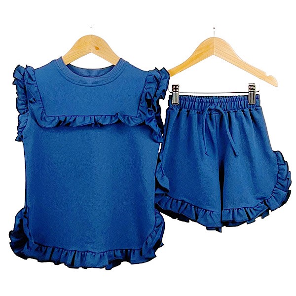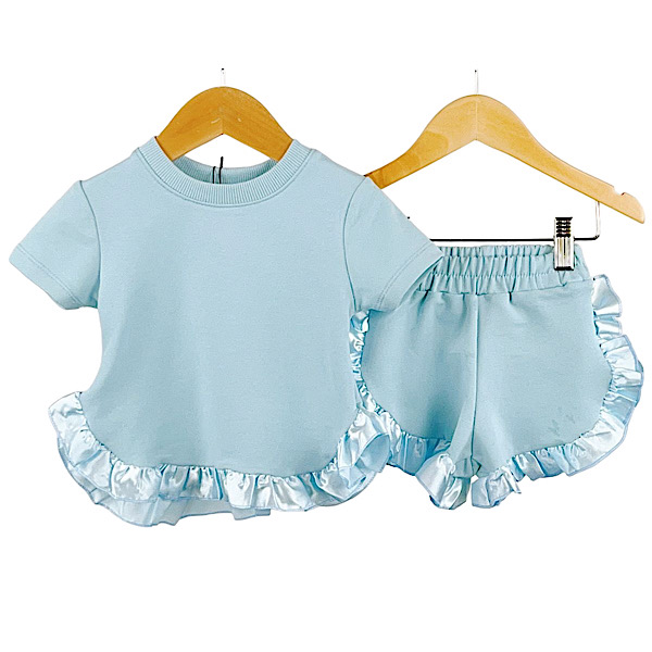 Kids Spanish style top with pinstripe & orange fruit print, round frilled collar and puffed short sleeves paired with co-ord shorts set.