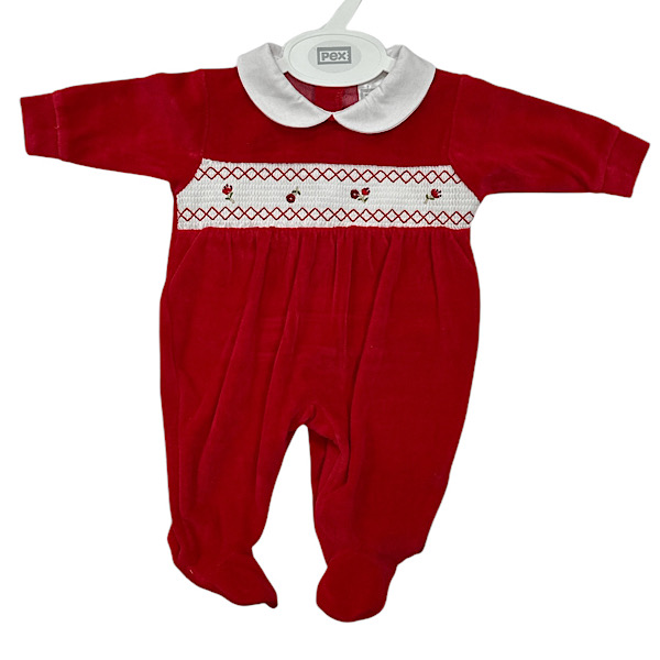 Baby pink and ivory cotton all-in-one sleepsuit outfit with ivory round frill collar and woven bow lace design.