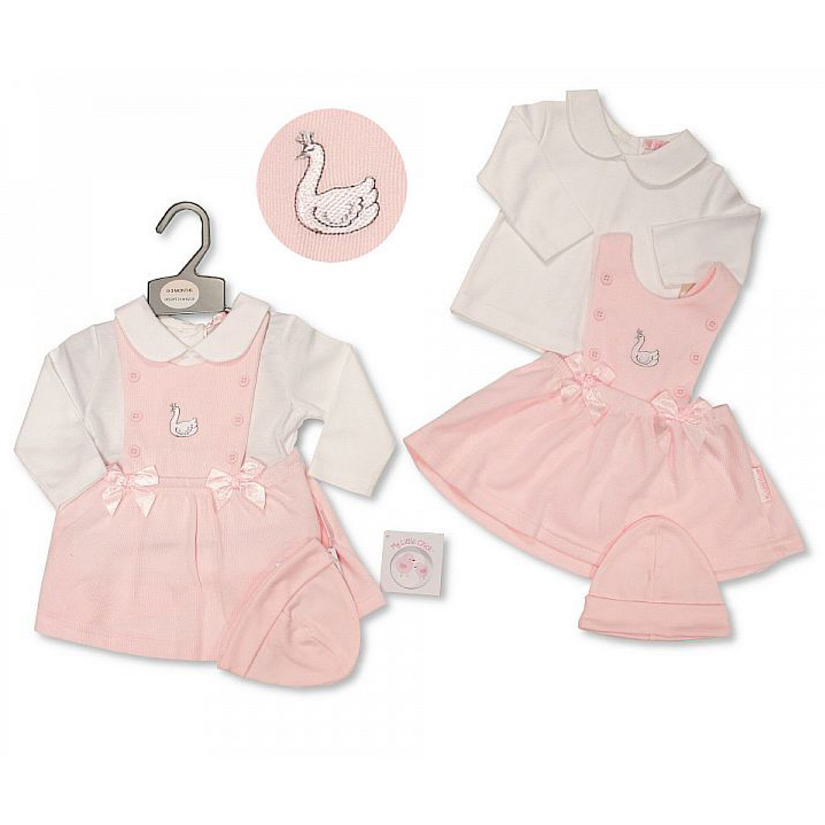 B/Pink & Ivory Swan Pinafore Dress 3PC Set NB-6M