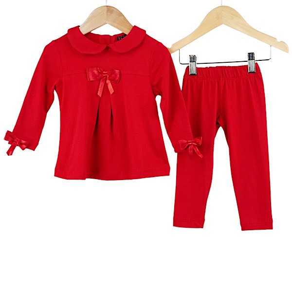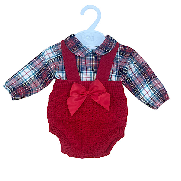 Baby red woven knitted three-piece outfit set with perforated Portuguese style round collar cardigan, top and upturned leggings.