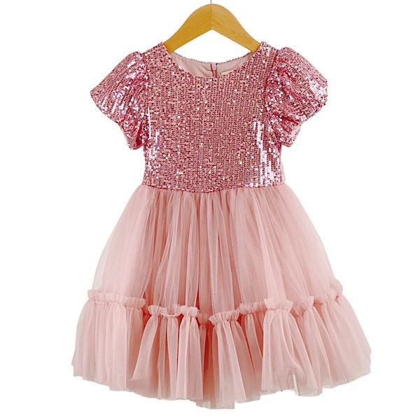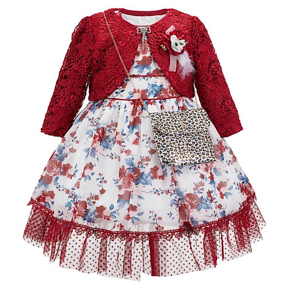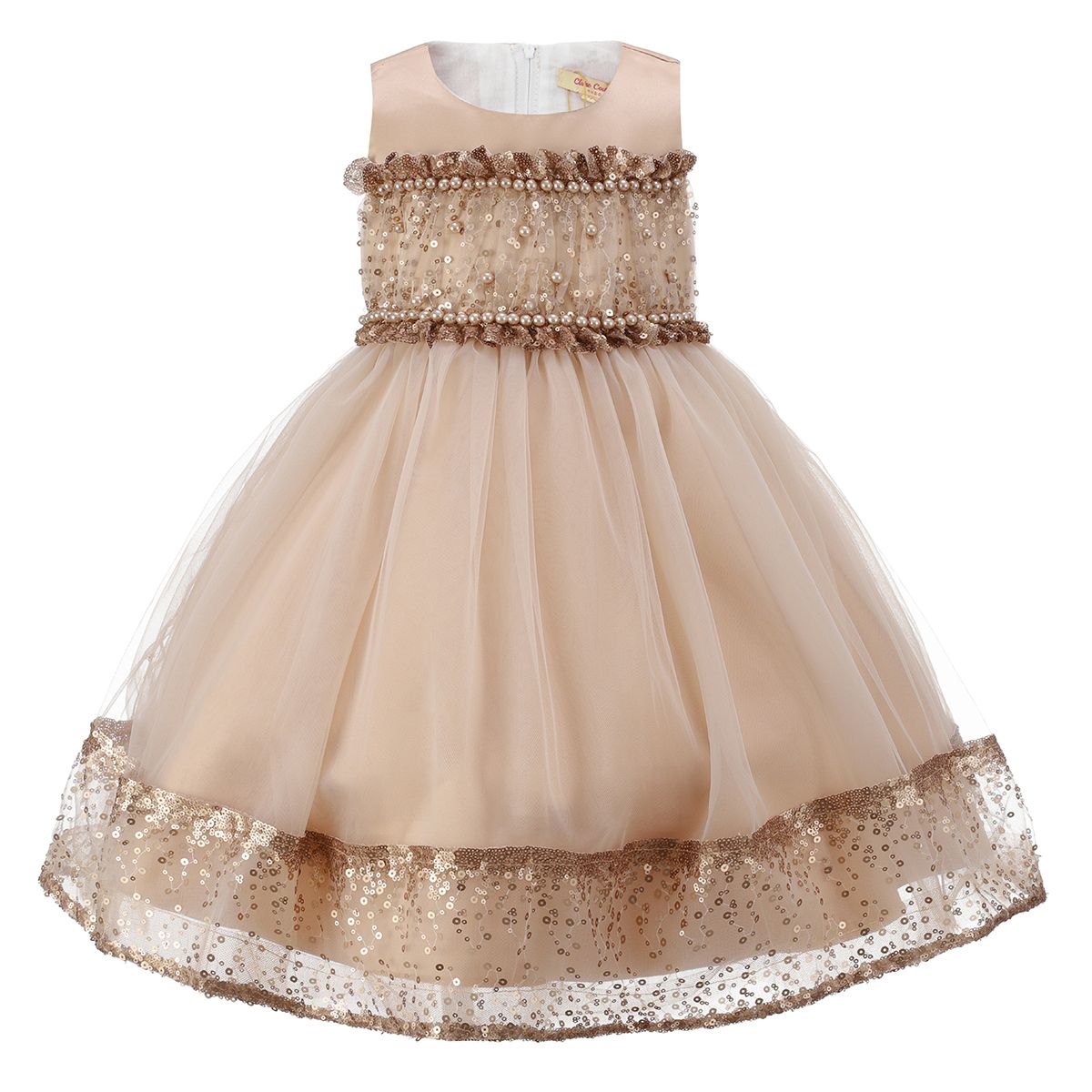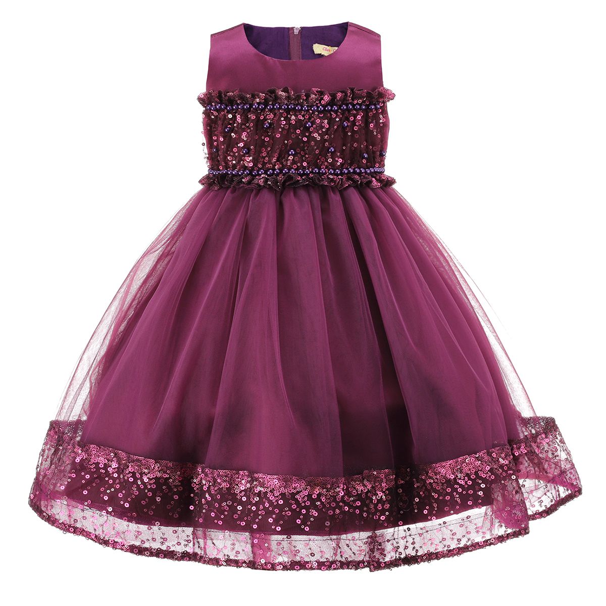 Kids red sleeveless layered peplum dress with sequin embellishment, ruffle organza net tulle skirt, satin lining, satin bow sash and back zip fastening.