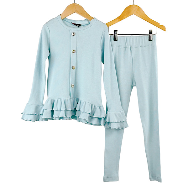 Kids red & white peplum faux shirt top with pearl studded ruched sleeve detail paired with co-ord cuffed lounge pants.
