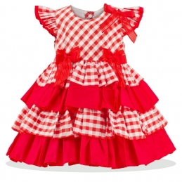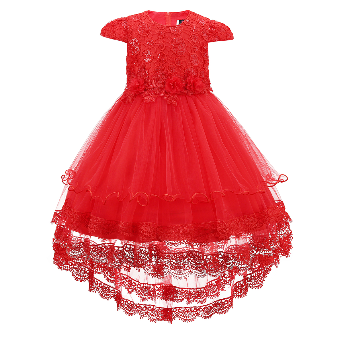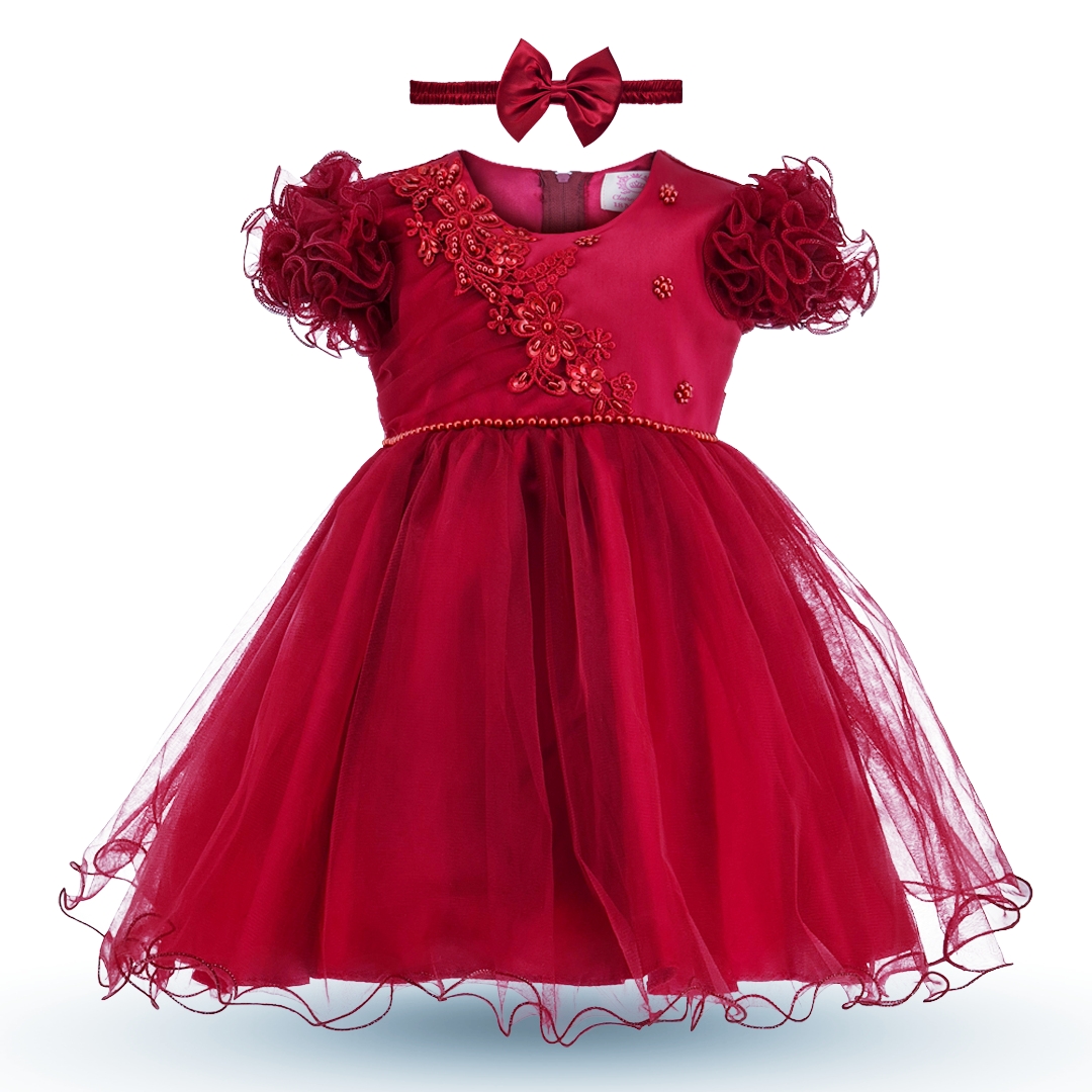 Baby & Toddlers two tone red & white long sleeve mesh net overlay dress with embroidered floral motif, front bow applique and back zip fastening.
