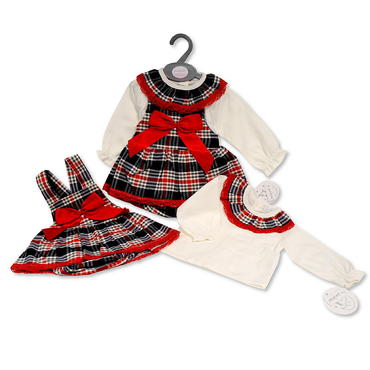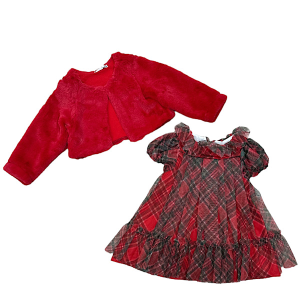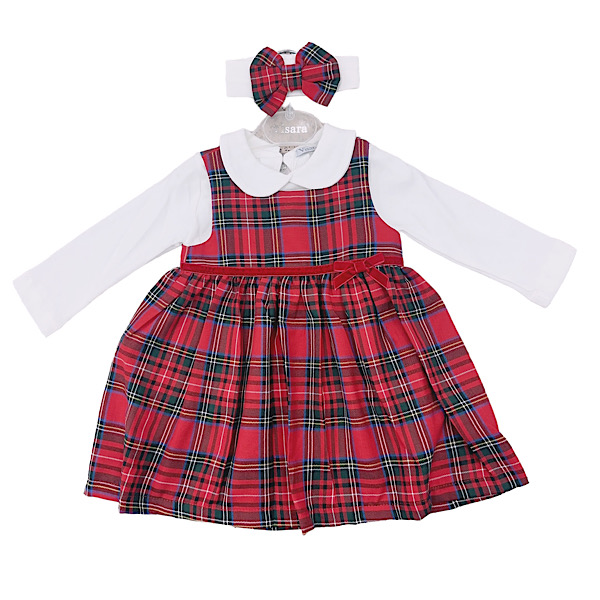 Baby & Toddler red tartan christmas dress with ivory lace and bow applique paired with bow headband set.