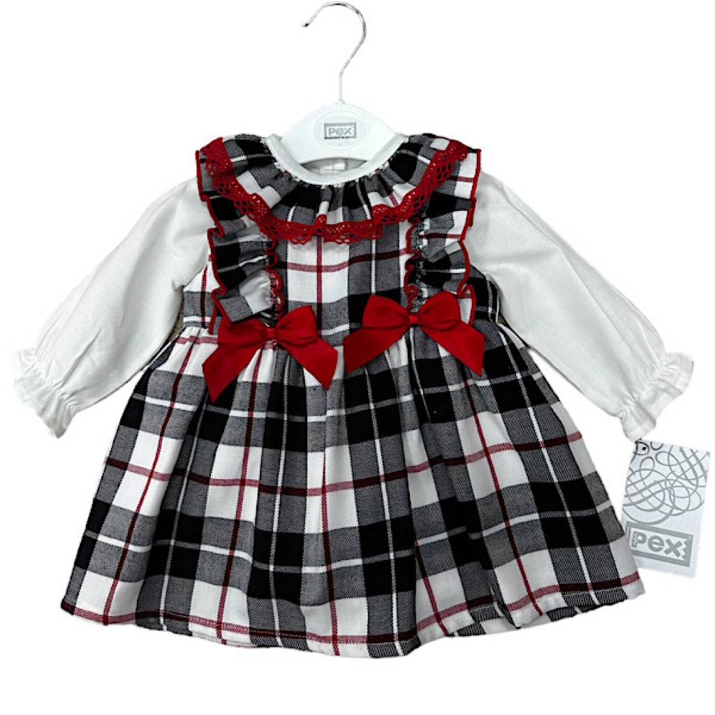 Visara three piece red tartan empire christmas dress with bow applique paired with co-ord red faux fur shrug jacket and bow headband set.
