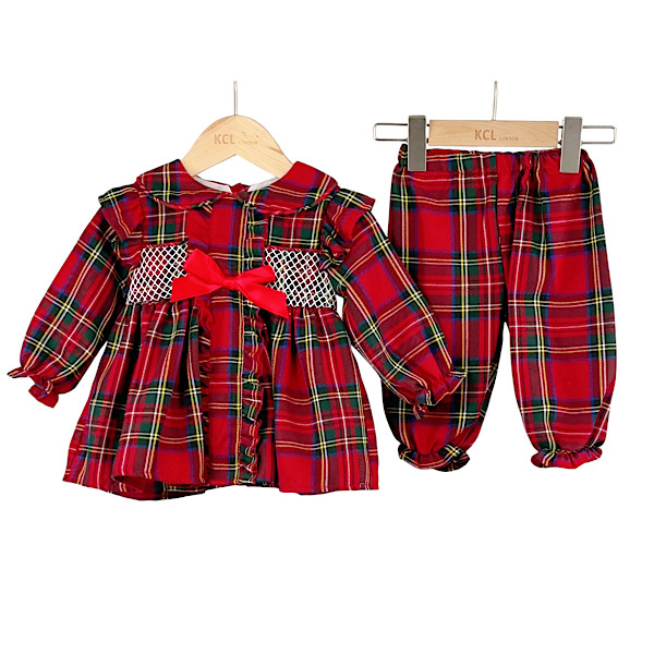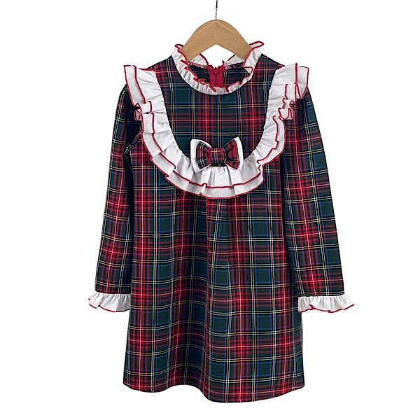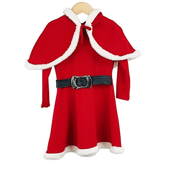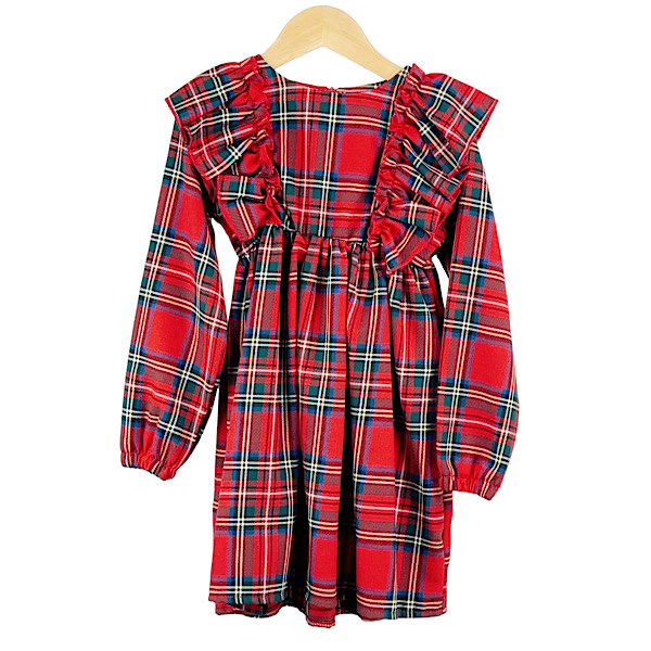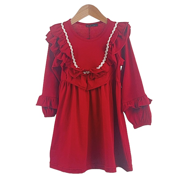 Toddlers & Kids red velour ruffle trim Christmas night dress with flare sleeves, sweetheart collar, button and white laced trim detail.