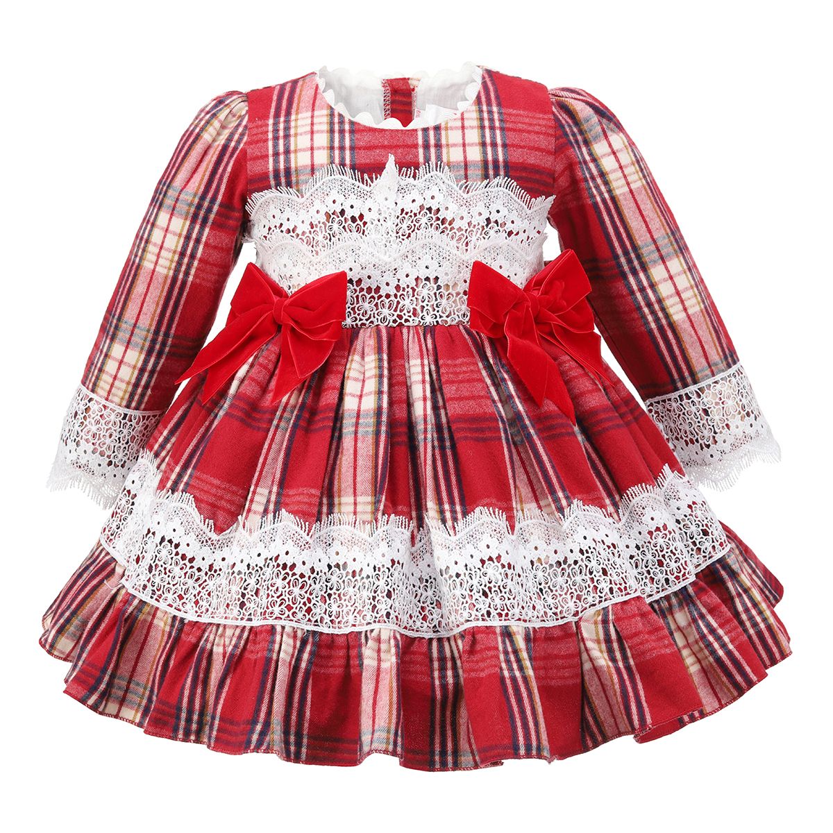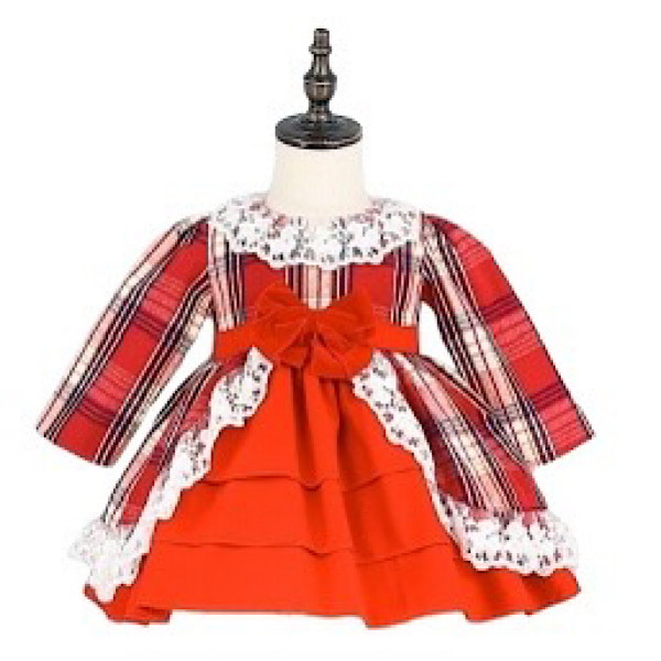 Baby & Toddlers wine red tartan Spanish Style dress with white petticoat, laced frill and back bow applique paired with co-ord frilly knickers.