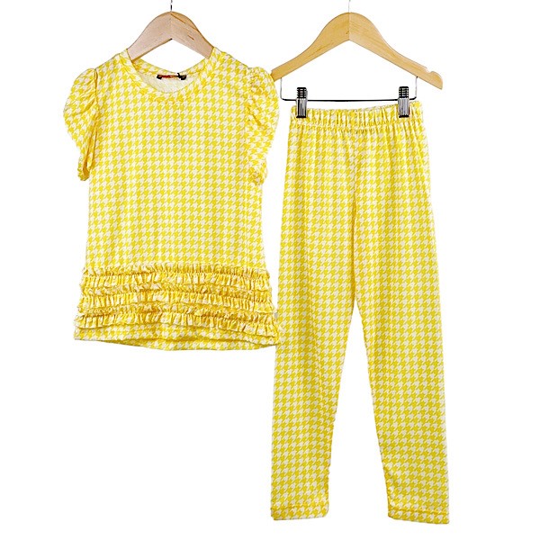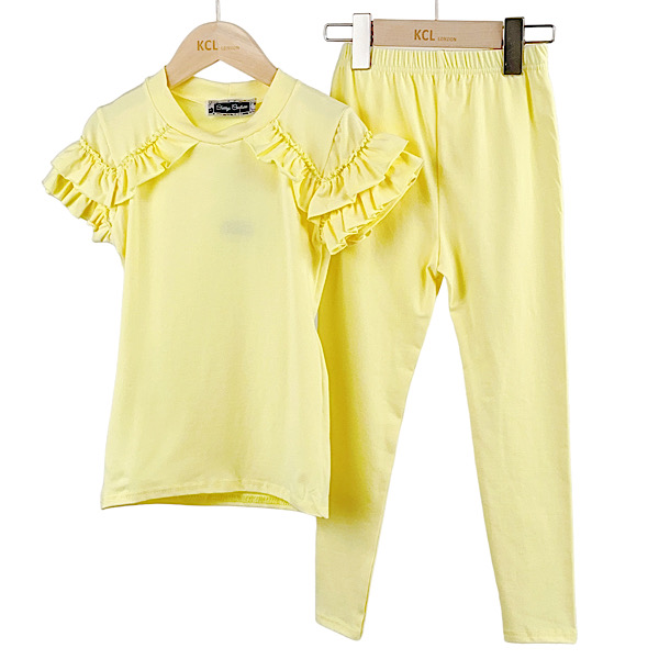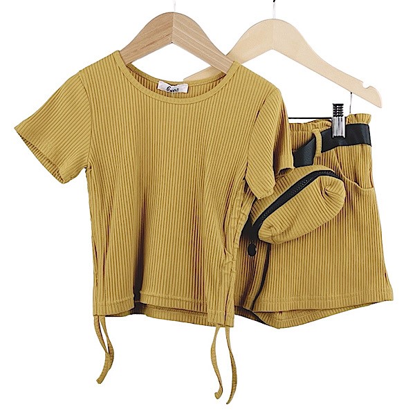Kids mustard yellow & grey tie dye cropped tank top with 'love' quote motif asymmetric crossed waistband detail paired with co-ord shorts set.