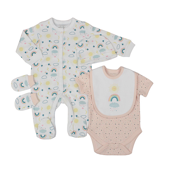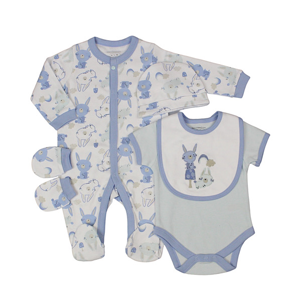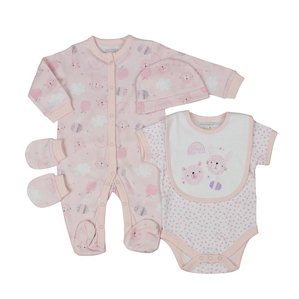 Baby Grey and White Two Tone Bear & Bee Motif Print 5pc Layette Set Included with Baby Grow, Body Suit, Mitten, Hat and Bib.