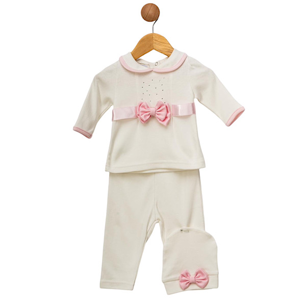 Ivory/Pink 3PC Bow Outfit & Hat Set 0-9M
