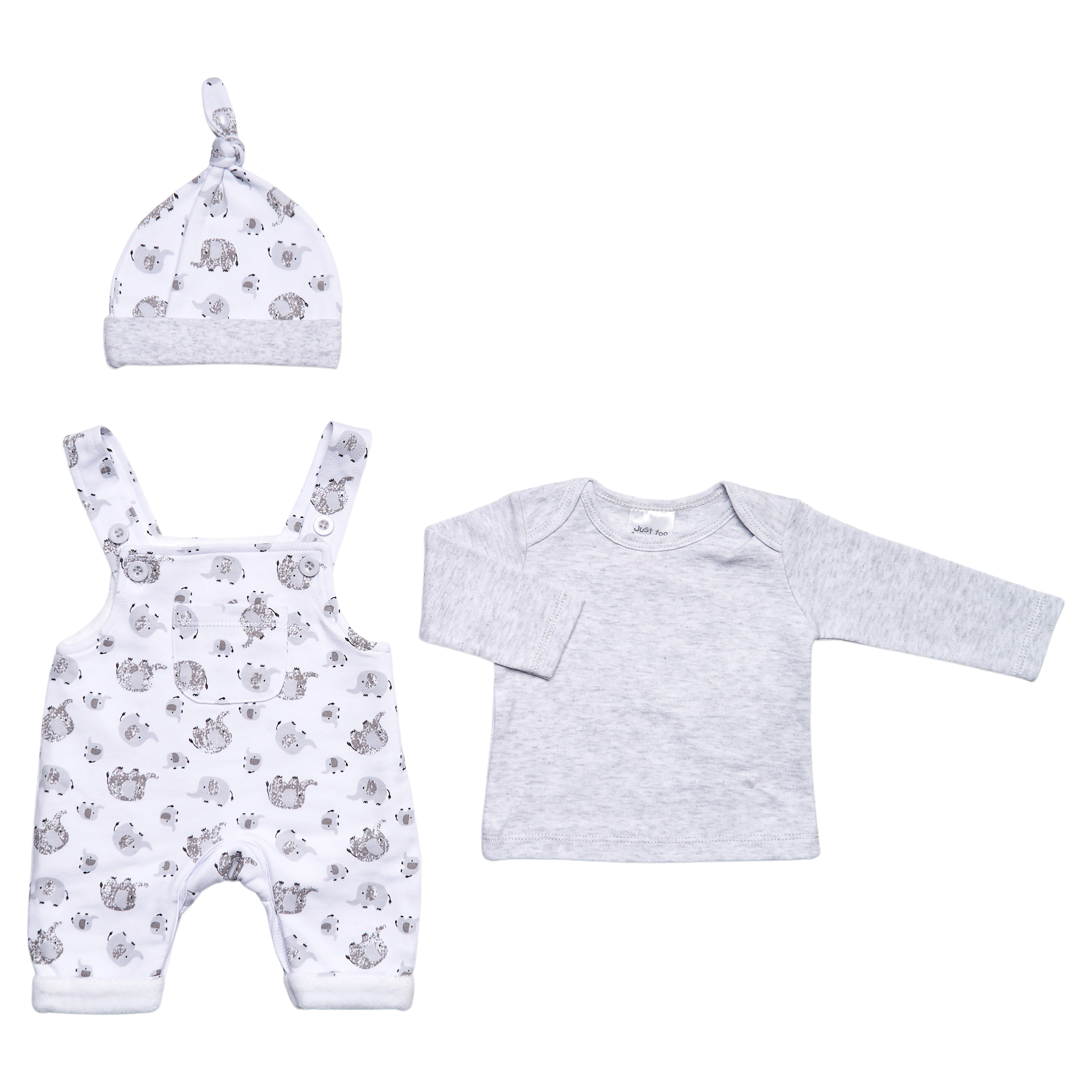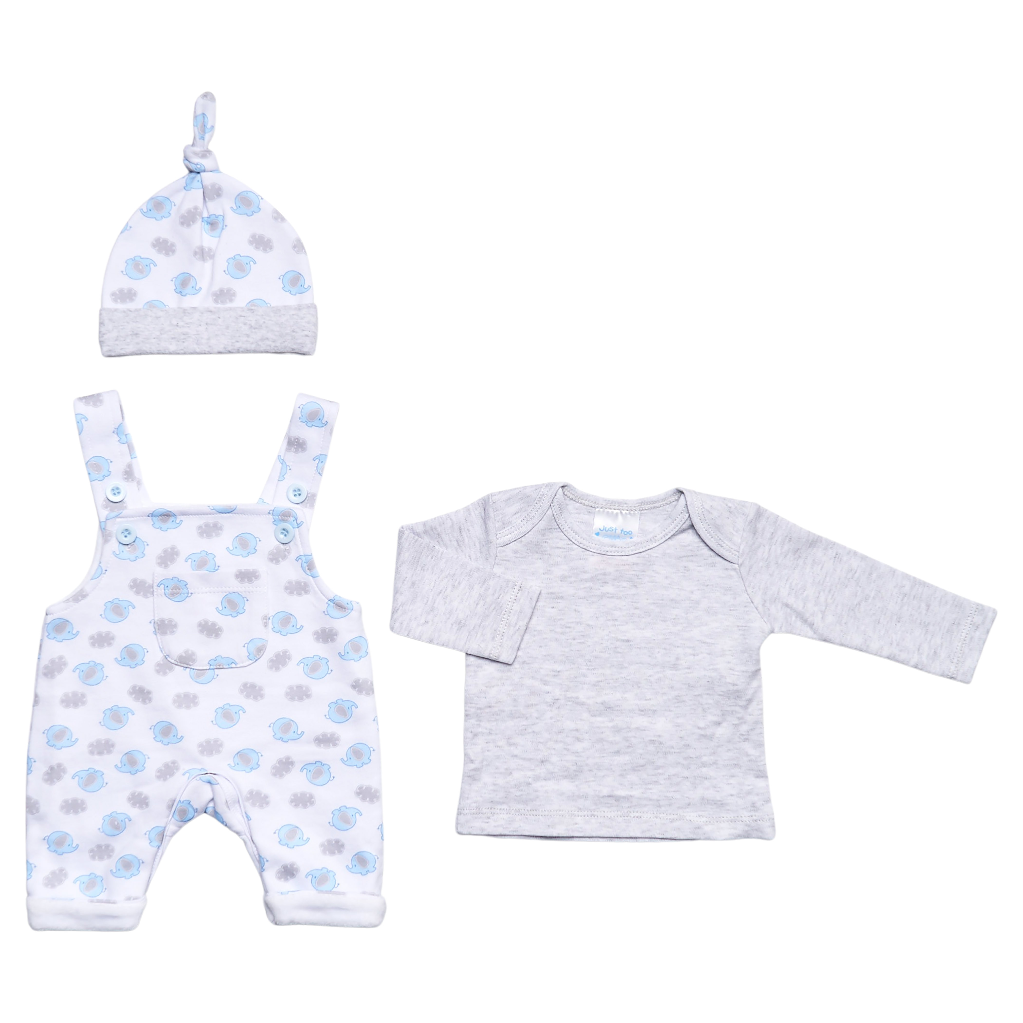 L/Grey & White Elephant 3PC Dungaree Set 3-8lbs