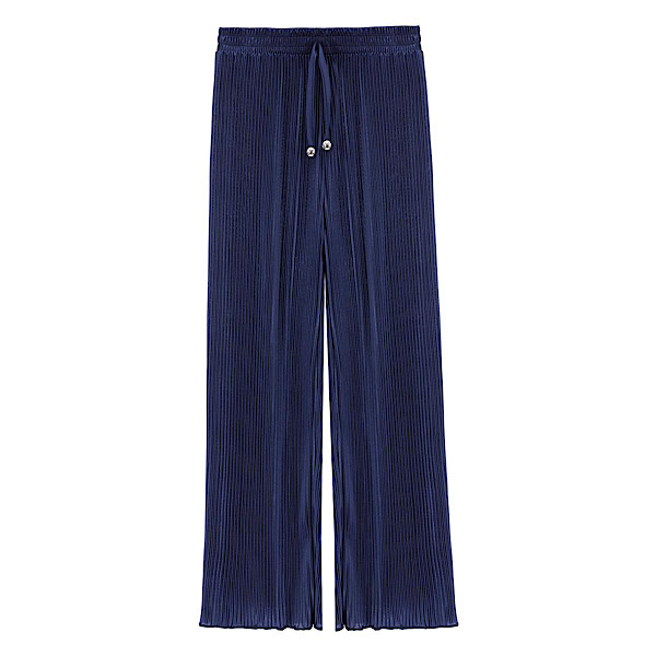 Ladies Navy Plissé Wide Leg Trousers S/M/L