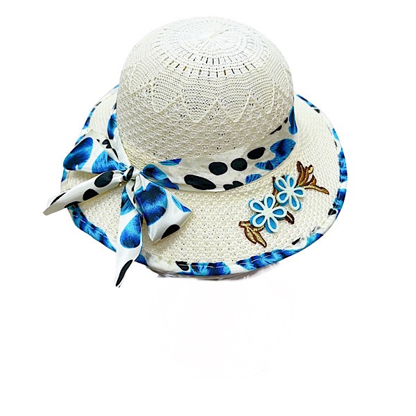 Girls Cream/Blue Polka scarf Bow Summer Hat