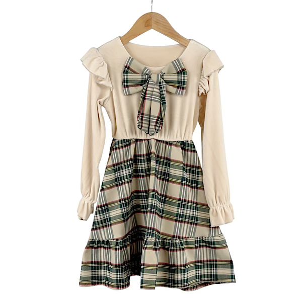 Biege Tartan Velour Pussy Bow Tier Dress 4-14