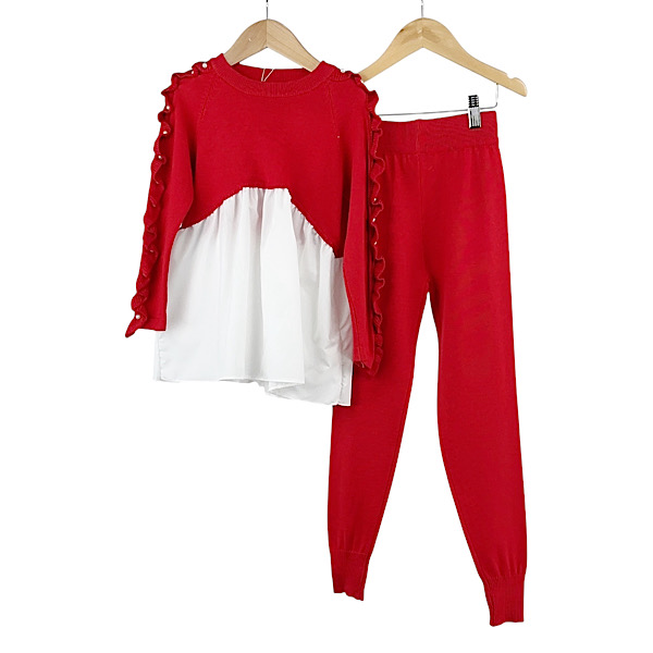 Red Faux Shirt Ruched Pearl Lounge Set 4-13