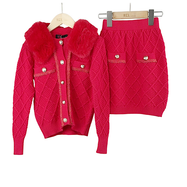 Red Diamond Knit Fur Cardigan & Skirt Set 2-12