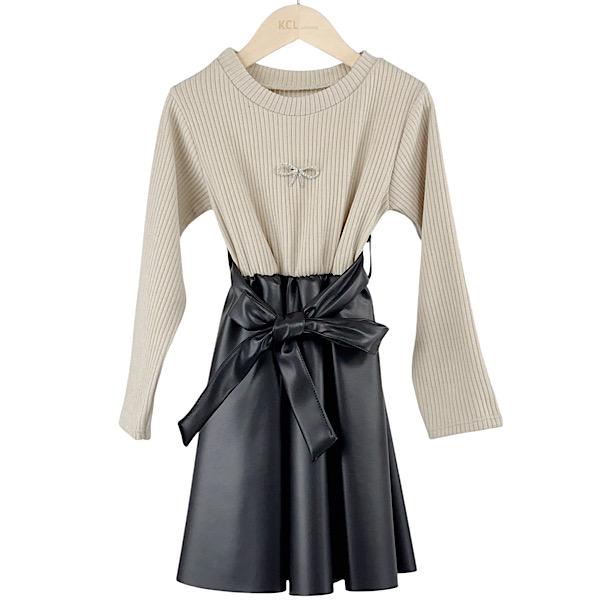 Beige Bow Wrap Tie PVC Faux Skirt Dress 4-14