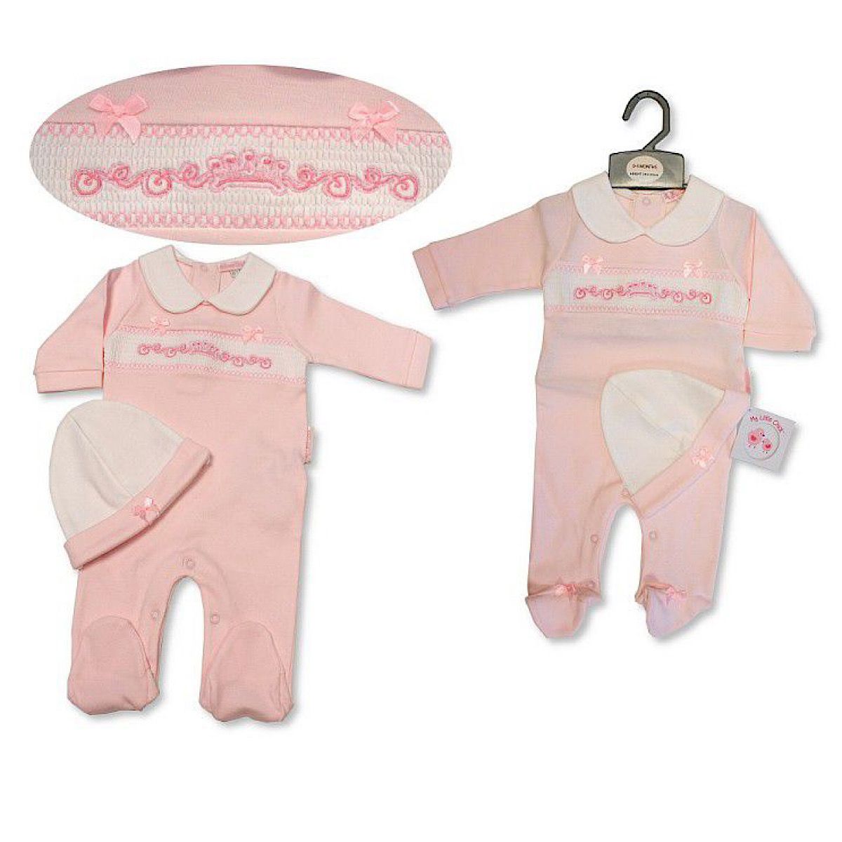 B/Pink Smocked Crown Sleepsuit & Hat NB-6M