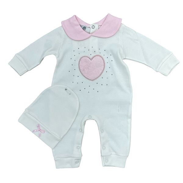 Ivory/Pink Heart Diamante Sleepsuit & Hat 0-9M