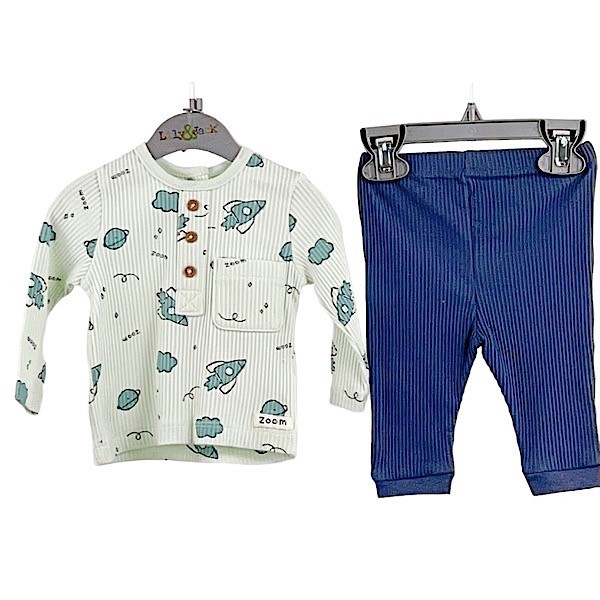 Rocket Ship Print Ribbed Top & Pants Set 0-9M