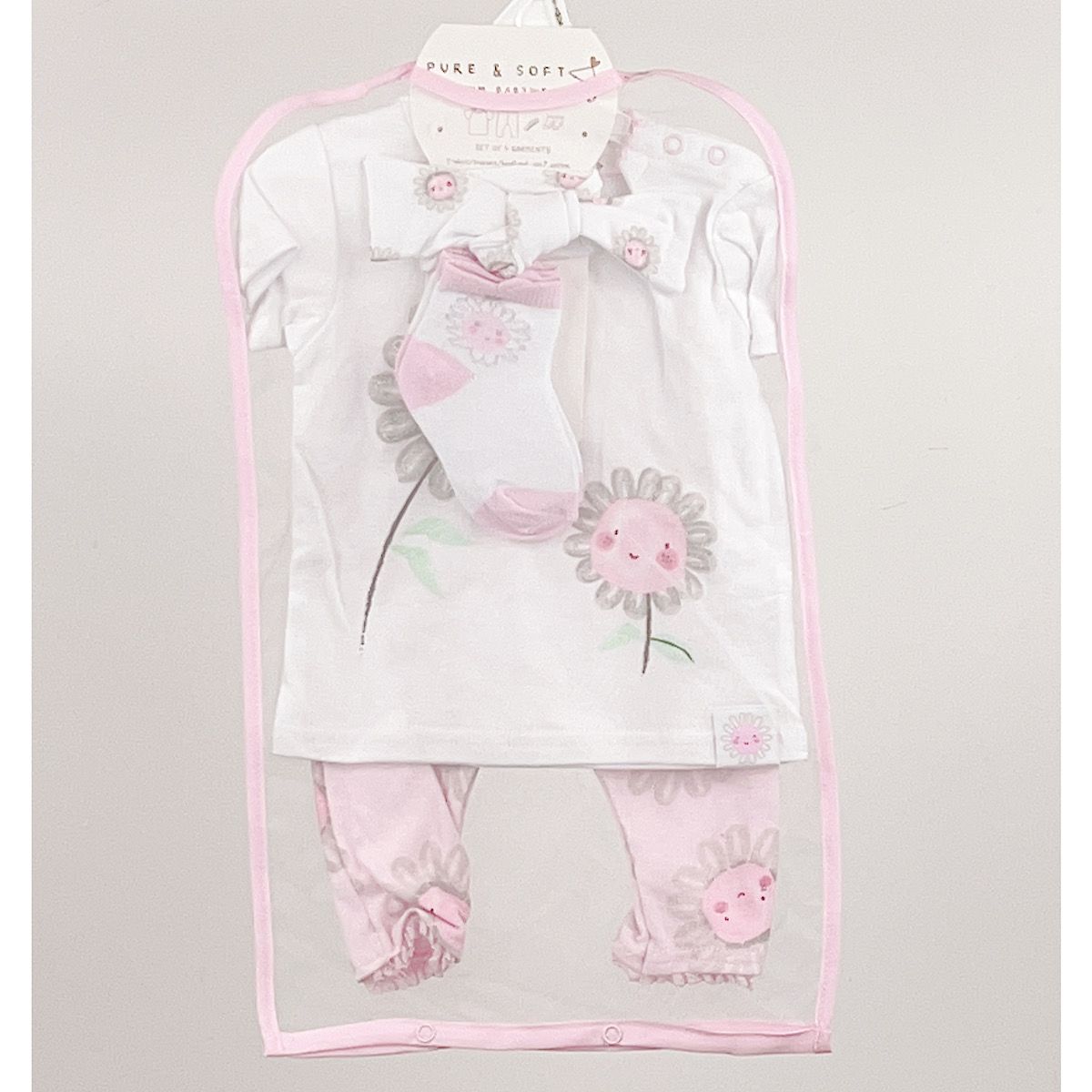 White & Pink Floral Print 4PC Layette Set 0-6M