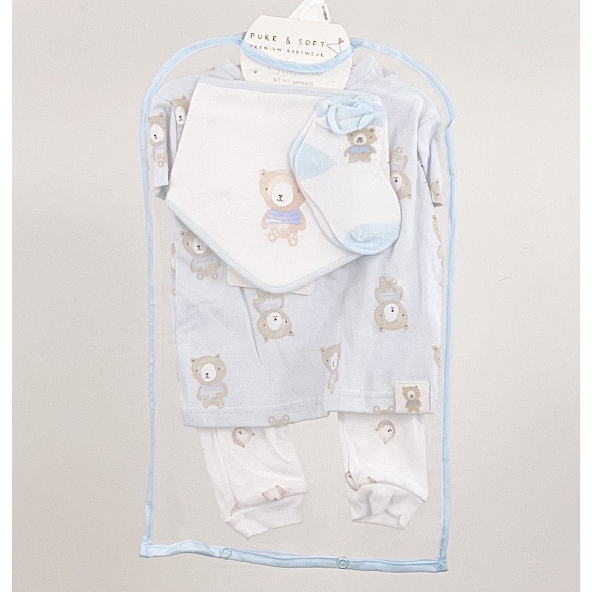 Blue Teddy Bear Print 4PC Layette Set 0-6M