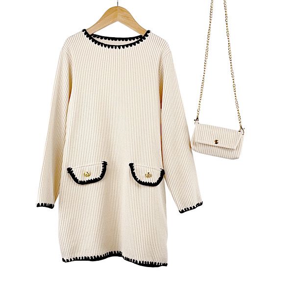Cream Rib Contrast Jumper Dress & Bag 4-14