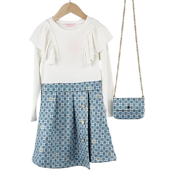 Beige Plaid Ruffle Faux Skirt Dress & Bag 4-14